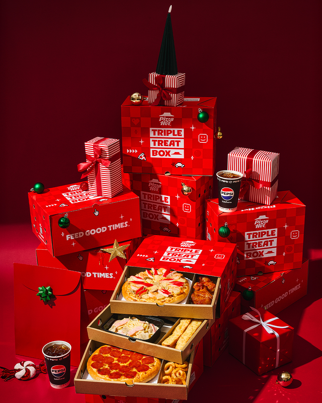 Get a free ๐ “Feed Good Times” Tote Bag + ๐งท 5 mixed “Hut Lover x Pepsi” collectible pins with every purchase of the Triple Treat Box at 699 THB / receipt.